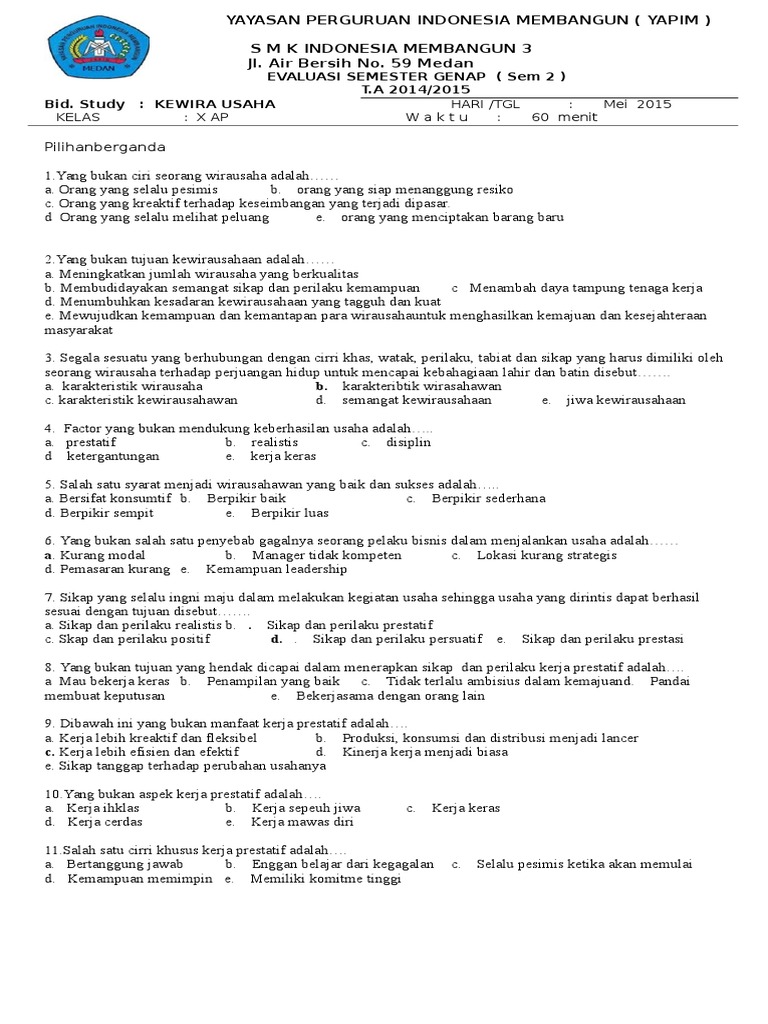 Tidak ada pengusaha atau pelaku bisnis yang menginginkan sebuah kegagalan dalam menjalankan sebuah bisnis. Yang bukan salah satu penyebab gagalnya seorang pelaku bisnis dalam menjalankan usaha adalah. Yang bukan tujuan yang hendak dicapai dalam menerapkan sikap dan perilaku kerja prestatif adalah….