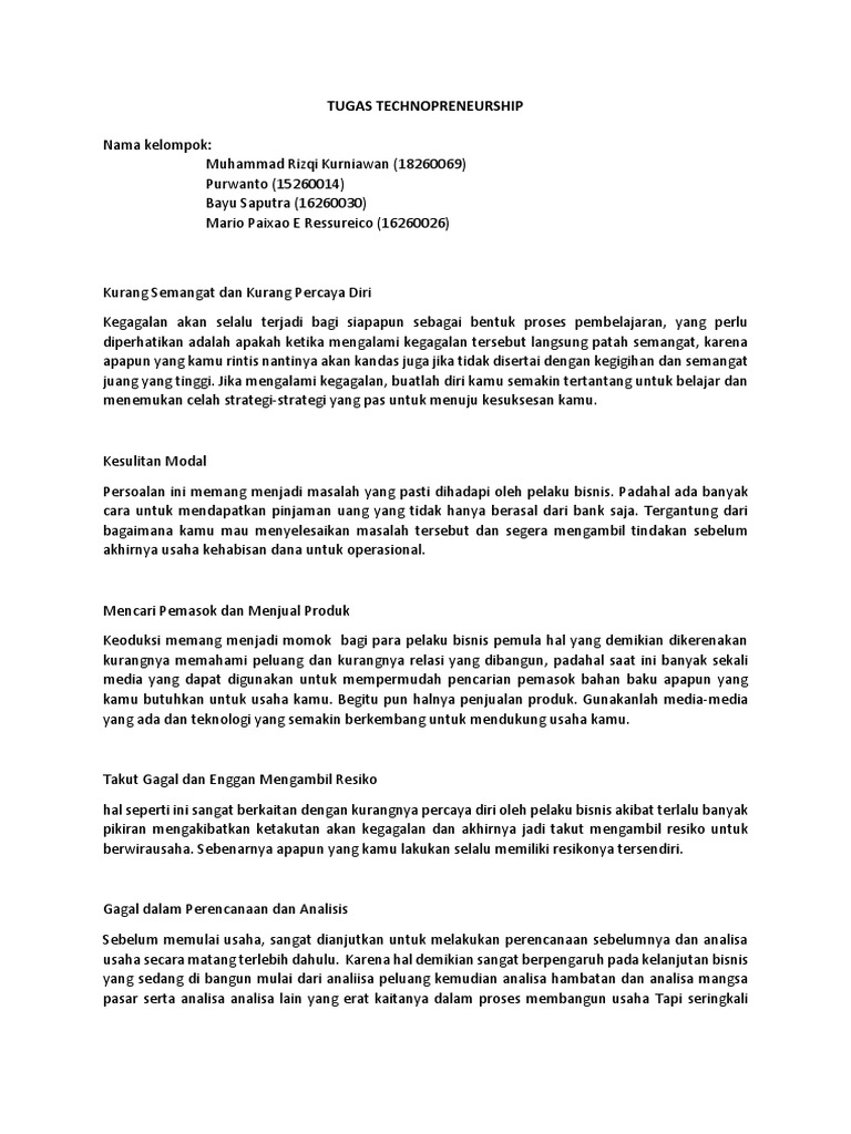 Minimnya pengalaman dalam bidang usaha bisa menjadi salah satu faktor penyebab kegagalan usaha. Menyukai tantangan selalu waspada terbuka terhadap perubahan antusias dan pantang menyerah senang bertanya 2. 1.definisi wirausaha adalah a.sikap selalu berpikir positif dalam menghadapi segala hal b.orang yang menjalankan usaha atau perusahaan dengan kemungkinan untung atau rugi c.sikap yang selalu ingin tahu, membuat ia selalu mencari jalan keluar bila ingin maju d.hal utama dalam memulai usaha atau menjadi seorang wirausahawan yang sukses